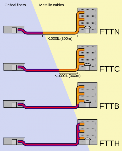 FTTH (فیبرنوری به خانه): فیبرنوری به مرز فضای زندگی می رسد، مانند جعبه ای در دیوار بیرونی خانه. شبکههای نوری passive و اترنت نقطه به نقطه، معماریهایی هستند که میتوانند خدمات triple-play services را روی شبکههای FTTH مستقیماً از دفتر مرکزی اپراتور ارائه دهند.