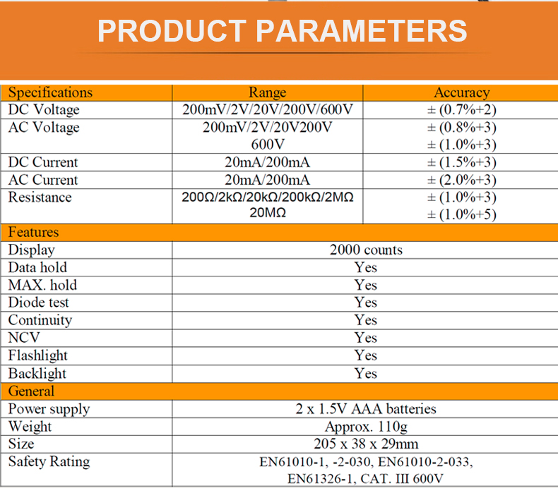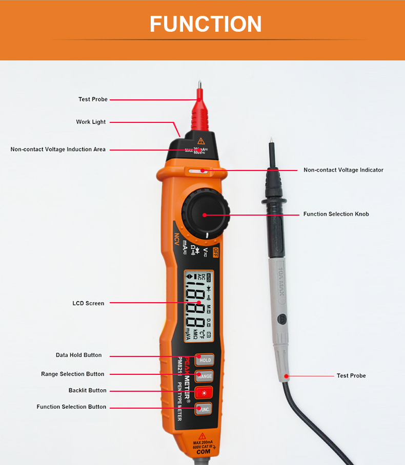 3. این ابزار می تواند ولتاژ DC ، ولتاژ AC ، جریان DC ، جریان AC ، مقاومت ، دیود و استمرار را با قابلیت تست ولتاژ غیر تماسی آزمایش کند و به کاربران امکان استفاده از امنیت و ایمن تر را می دهد.